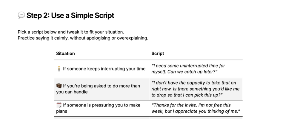This Google Doc includes practical exercises to help you work through any social interactions that might be stressing you out, with handy prewritten scripts that you can use next time you find yourself in a tricky situation.
